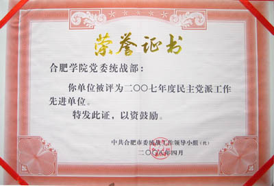日前,在剛剛結束的全市統戰工作會議上,我院黨委統戰部受到合肥市委統戰部的表彰,榮獲“2007年度民主黨派工作先進集體”光榮稱號。