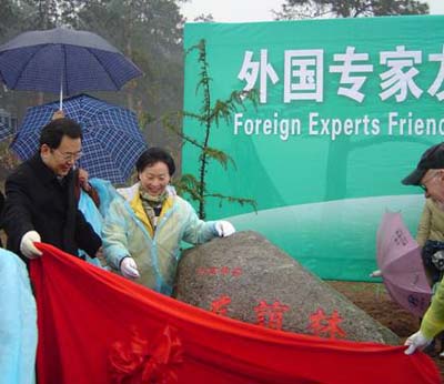 3月21日上午,我院組織來自韓國、德國、美國的10名外國專家冒雨來到合肥大蜀山森林公園,與來自合肥各高校、企業(yè)和科研單位的58名外國專家一起參加了由安徽省外國專家局舉辦的“外國專家友誼林”揭碑儀式暨植樹造林活動(dòng)。韓國專家、“國家友誼獎(jiǎng)”獲得者趙誠惠教授作為特邀嘉賓,與安徽省委常委、常務(wù)副省長孫志剛一起為“外國專家友誼林”揭碑并共同種下了象征和平友誼的香樟樹。盡管雨在不停地下,外國專家們?nèi)耘d致勃勃地身著雨衣、腳穿膠鞋,植下了一棵棵友誼與和平之樹。