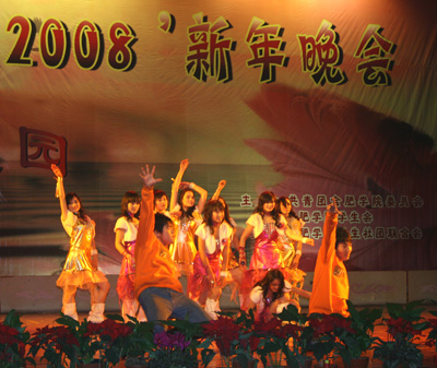 接下來是主題為“和諧校園”的2008新年晚會。新年晚會共分四個篇章,大學生藝術合唱隊演唱的《祝福祖國》和《瀏陽河》掀開了第一篇章“和,和校園之音”,另有異域風情的《蒙古風》帶給觀眾強烈的震撼。在第二篇章“諧,攜文化之韻”里,話劇《自習室》以詼諧幽默的方式揭示維護教室文明的重要性。《魔術與書法》這一節目巧妙地把魔術和書法兩種風格迥異的藝術形式結合起來,博得現場觀眾的陣陣掌聲。第三篇章“校,效奮進之風”,教育系陳琳老師的獨唱《我愛你,中國》表達了對祖國的深深愛戀。第四篇章“園,圓新春夢想”,外語系四名學生分別用英韓德日四國語言為我們獻上了新春祝福。最后晚會在全體演出人員的合唱《明天會更好》中圓滿結束。