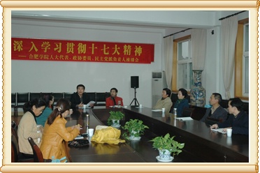 “要在思想上跟進時代發展,堅持中國共產黨的領導,發揮民主黨派的參政、議政作用,結合工作實際,深入學習貫徹十七大精神。”民進合肥學院總支主委周鸝在日前合肥學院舉行的各級人大代表、政協委員、民主黨派負責人座談會上如是說。