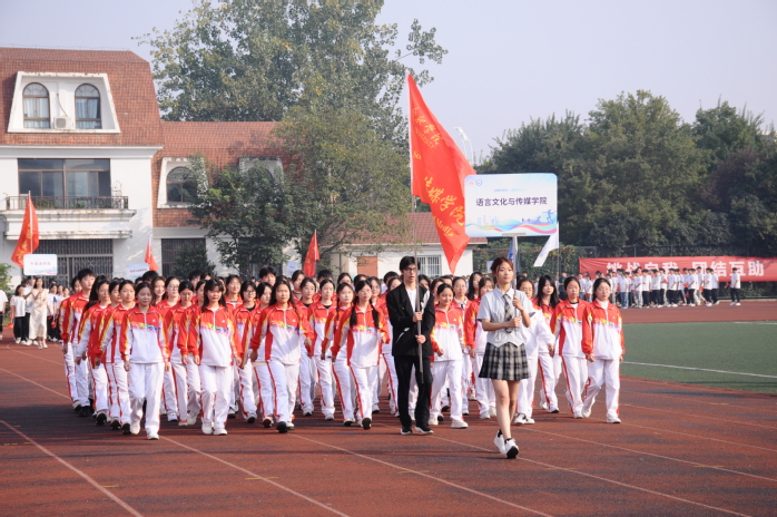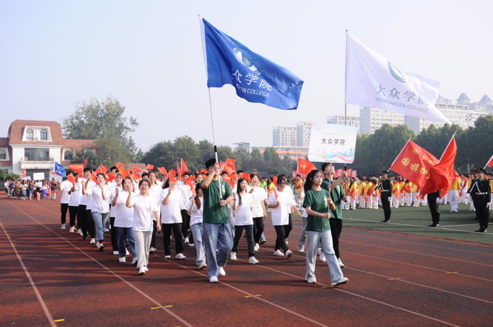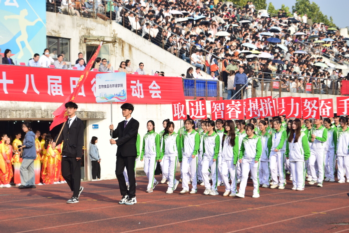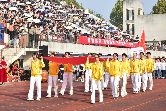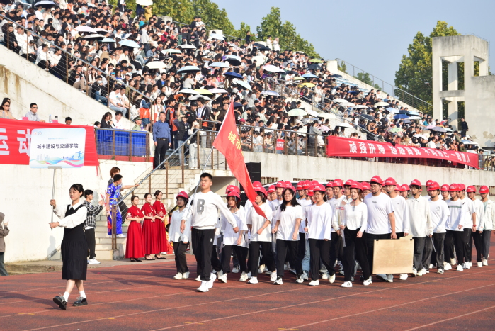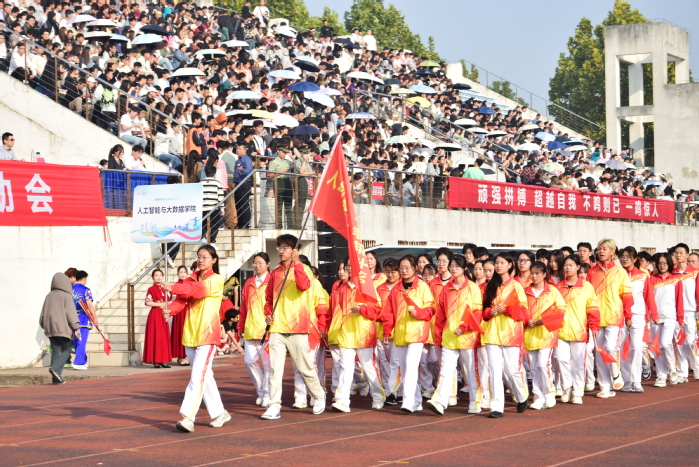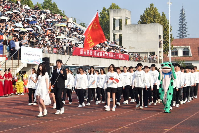 校國旗隊方陣托舉國旗率先入場,伴隨著雄渾壯闊的《運動員進行曲》,各二級學院、留學生、研究生代表隊緊隨其后,邁著鏗鏘有力的步伐依次走過主席臺前方。戴著紅色建筑安全帽的城市建設與交通學院方陣隊昂首闊步向前,能源材料與化工學院方陣攜化學元素周期表盡顯專業風采。“先進制造、制造先進,勇往直前、永不言敗”“信篤志堅、奮勇爭先,外院學子、拼搏向前”……響亮豪邁的口號聲此起彼伏。整齊的步伐、揮舞的旗幟,展現著全校運動健兒們團結向上、奮力拼搏的精神風貌。