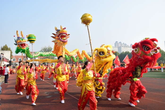 各體藝俱樂部為全場師生帶來了精彩紛呈的文藝表演,觀眾席喝彩連連。首先登場的是舞龍舞獅和武術,運動員手舞長龍、穿梭前進,群獅翻騰、千姿百態、妙趣橫生,校領導親自為舞龍舞獅點睛。伸臂、踢腿、旋轉、跳躍,靈活的舞姿與有力的鼓點在操場上交織,舞蹈、瑜伽、啦啦操等表演詮釋著青春之美、律動之美、活力之美,充分展現了學校體育教學成效和學生的專業能力水平。