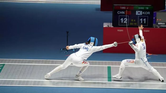 在1/4決賽中,中國隊以45:39的比分,輕松戰(zhàn)勝哈薩克斯坦隊進入半決賽。在半決賽,面對實力強大的韓國隊,中國姑娘們迎難而上,唐君瑤在比賽中表現(xiàn)出的沖勁讓人印象深刻。“中國隊加油!”中國隊每獲得一分,現(xiàn)場都爆發(fā)出雷鳴般的加油吶喊聲,雙方比分一直咬得很緊。最終中國姑娘們以總比分27比30遺憾負于韓國隊,止步半決賽,獲得銅牌,這也是我校學(xué)子在今年8月奪得成都世界大學(xué)生運動會女子重劍金牌和男子重劍銀牌后的又一塊國際重要賽事獎牌。