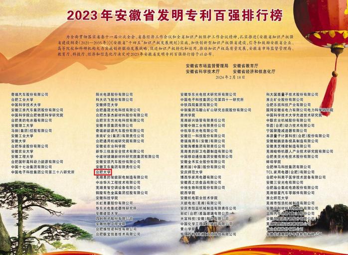 近日,省市場(chǎng)監(jiān)督管理局、省教育廳、省科技廳、省經(jīng)信廳聯(lián)合發(fā)布了《2023年安徽省發(fā)明專利百?gòu)?qiáng)排行榜》。我校繼2021年排名第37位、2022年排名第34位后,2023年升至第32位,連續(xù)九年進(jìn)入安徽省發(fā)明專利百?gòu)?qiáng)榜。