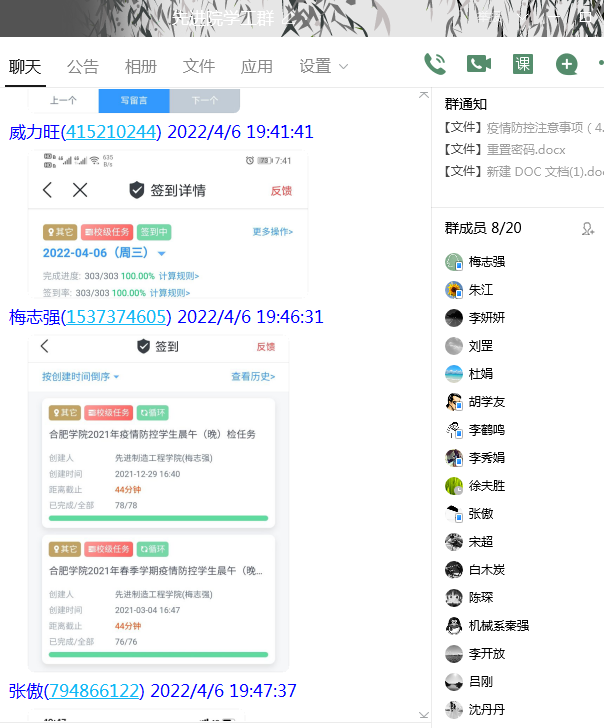 一是聯(lián)防聯(lián)控前移。按照學(xué)校統(tǒng)一部署,迅速建立起院系兩級“聯(lián)防聯(lián)控”工作機制、“線上線下”工作網(wǎng)絡(luò)。建立信息暢通機制。通過院網(wǎng)站、先進視野微信公眾號、QQ群、微信群等多種渠道,第一時間將學(xué)校最新通知和權(quán)威信息傳遞到每一位師生。建立三套機制。完善學(xué)生日常管理組、黨員志愿服務(wù)組、應(yīng)急處突保障組“三套值班機制”,確保志愿服務(wù)黨員沖鋒在前,日常管理平穩(wěn)有序。建立數(shù)據(jù)填報機制。通過明確負責(zé)人、明確填報要求、明確數(shù)據(jù)失實責(zé)任,實行防疫數(shù)據(jù)填報“全覆蓋、日報告、零報告”制度,全面、動態(tài)掌握師生詳細情況。