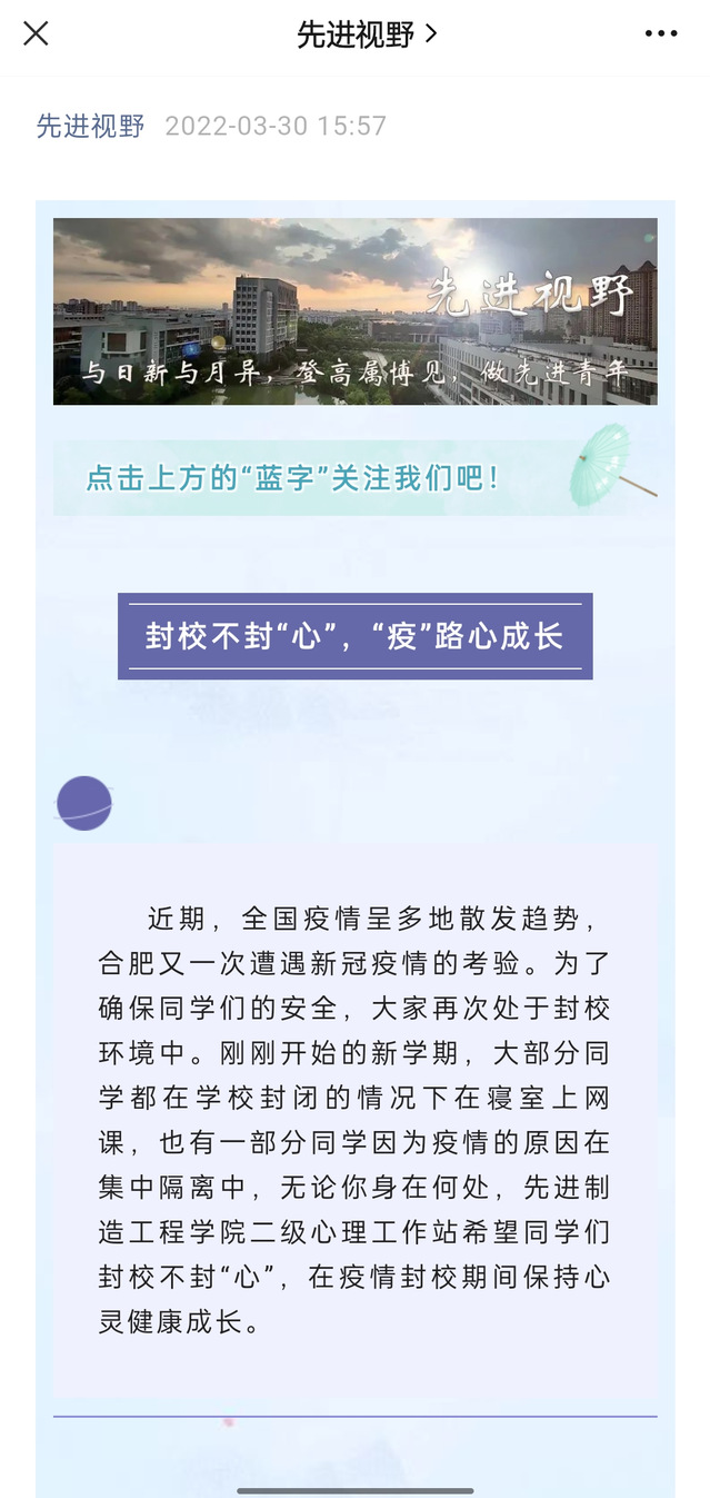 為緩解因疫情引發的恐慌、焦慮等情緒,學院通過微信公眾號為師生提供科學合理的心理調適方法,發布科學防控文章。認真學習合肥市教育局主辦的《新冠疫情背景下的學生心理問題與健康促進》和教育部發布的《學生疫情防控期間學習生活健康指南》,有的放矢提高心理工作能力,用心守護好每一位學生。