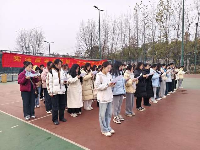 12月13日清晨,參加活動的學生以飽滿的精神狀態在一期校園體育場集合?;顒右潦?,全體學生排好隊形,整齊肅立。隨后,在領讀同學的帶領下,一起朗讀《憲法》的節選內容。天氣雖然寒冷,但我院學子神情專注而又莊重,朗讀聲清晰而又堅定。在每一聲鏗鏘有力的聲音中,學生們用昂揚向上的熱情驅散了寒意,用奮進拼搏的姿態推動了憲法晨讀活動走向高潮。