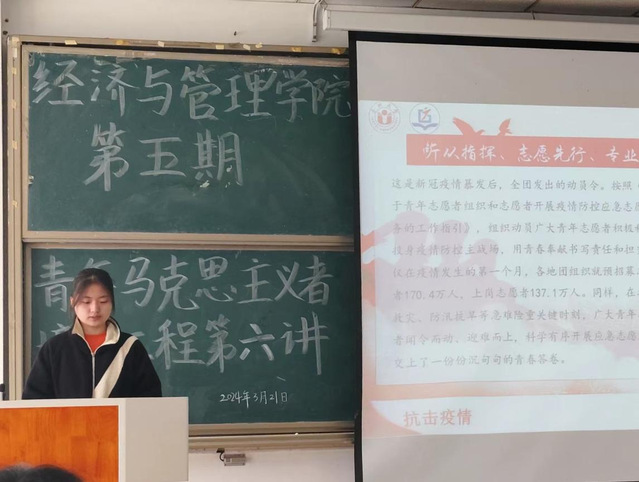 為了加強同學們對馬克思主義的了解,弘揚馬克思主義精神。3月21日,經濟與管理學院第五期青年馬克思主義者培養工程第六講于一期5-101教室順利開展,此次課程由團委學生兼副書記梁雨潤同學主講,經濟與管理學院第五屆團委學生會成員與23級新生班干參與學習。 會議伊始,全體成員起立奏唱團歌。隨后梁雨潤同學從“青馬工程”引起討論,系統的說明了廣大青年志愿者所具有的精神品質。隨后,梁雨潤同學分別列舉了西部地區志愿者,疫情防控志愿者,奧運會志愿者等例子,對“未來的國際舞臺上勢必會有更多的中國方式展現當代中國青年的抱負與擔當”進行了說明。最后,梁雨潤同學為大家播放了相關視頻,更好的詮釋了“力行‘民之小事’”的理念。 此次課程開展后,同學們紛紛表明愿投身于建設中國特色社會主義新的偉大使命的事業中去。 (經濟與管理學院 撰稿人:沈茹茹 審稿人:姚璇)