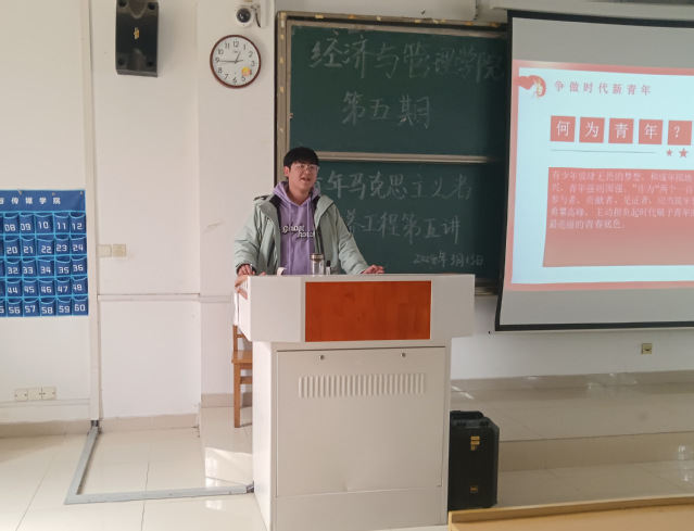 為加強對青年大學生的思想政治引領,著力為黨培養和輸送青年政治骨干,2024年3月13日經濟與管理學院第五期青年馬克思主義者培養工程第五講于一期校園五棟101室成功舉行。此次課程由經濟與管理學院團委主席支晨濤同學主講,第五屆團委學生會成員與23級新生班干參與學習。 首先,全體成員起立奏唱團歌。隨后,支晨濤同學為學員們講授青馬班第五講﹣“爭做時代新青年”。支晨濤從“何為青年”、“清澈的愛,只為中國”、“新時代青年任務”、“爭做時代新青年”四個方面內容介紹,引導學員們進一步增強思想自覺,政治自覺和行動自覺,做新時代堅定有為的青年馬克思主義者。 此次講謀圓滿結束,同學們倍感振奮、倍受鼓舞,紛紛表示將會不斷激發自身潛力,實現人生理想,展現個人價值,讓自己成為一個真真正正對祖國和人民有貢獻的人。 (經濟與管理學院撰稿人:張祎審稿人:姚璇)