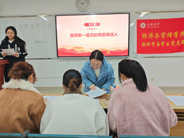 11月26日,經(jīng)濟與管理學(xué)院國際貿(mào)易學(xué)生黨支部順利召開黨員大會。本次會議旨在傳達學(xué)習(xí)學(xué)校有關(guān)文件精神,并推薦學(xué)院新一屆黨的委員會和紀律檢查委員會委員候選人。 會議伊始,黨支部書記劉丹青領(lǐng)學(xué)習(xí)近平總書記關(guān)于巡視巡察工作的重要論述、《中國共產(chǎn)黨巡視工作條例》和《近三年黨中央、安徽省委巡視工作相關(guān)會議精神學(xué)習(xí)匯編》等文件精神,結(jié)合國際貿(mào)易學(xué)生黨支部的實際情況,對黨員們提出了具體的工作要求,切實把思想和行動統(tǒng)一到學(xué)校黨委的決策部署上來,充分發(fā)揮黨員的先鋒模范作用,為黨支部的建設(shè)和發(fā)展貢獻力量。 會議第二項,推薦學(xué)院新一屆“兩委”委員候選人。為確保推薦工作的公正、公平、公開,黨支部書記劉丹青詳細介紹了“兩委”委員必須具備的條件,并強調(diào)了推薦工作的重要性和意義。接著,全體正式黨員按照學(xué)校黨委有關(guān)文件精神的要求,結(jié)合候選人的政治素質(zhì)、工作能力、群眾基礎(chǔ)等方面的表現(xiàn),獨立填寫推薦票。 會議最后,黨支部書記劉丹青要求全體黨員繼續(xù)深入學(xué)習(xí)黨的理論和路線方針政策,不斷提高自身的政治素質(zhì)和業(yè)務(wù)能力;要積極參與黨支部的各項工作和活動,為黨支部的建設(shè)和發(fā)展貢獻自己的力量;要時刻保持黨員的先進性和純潔性,樹立良好的黨員形象。 此次黨員大會的召開,不僅傳達學(xué)習(xí)了學(xué)校有關(guān)文件精神,也順利完成了新一屆“兩委”委員候選人的推薦工作,增強了支部的凝聚力和向心力。