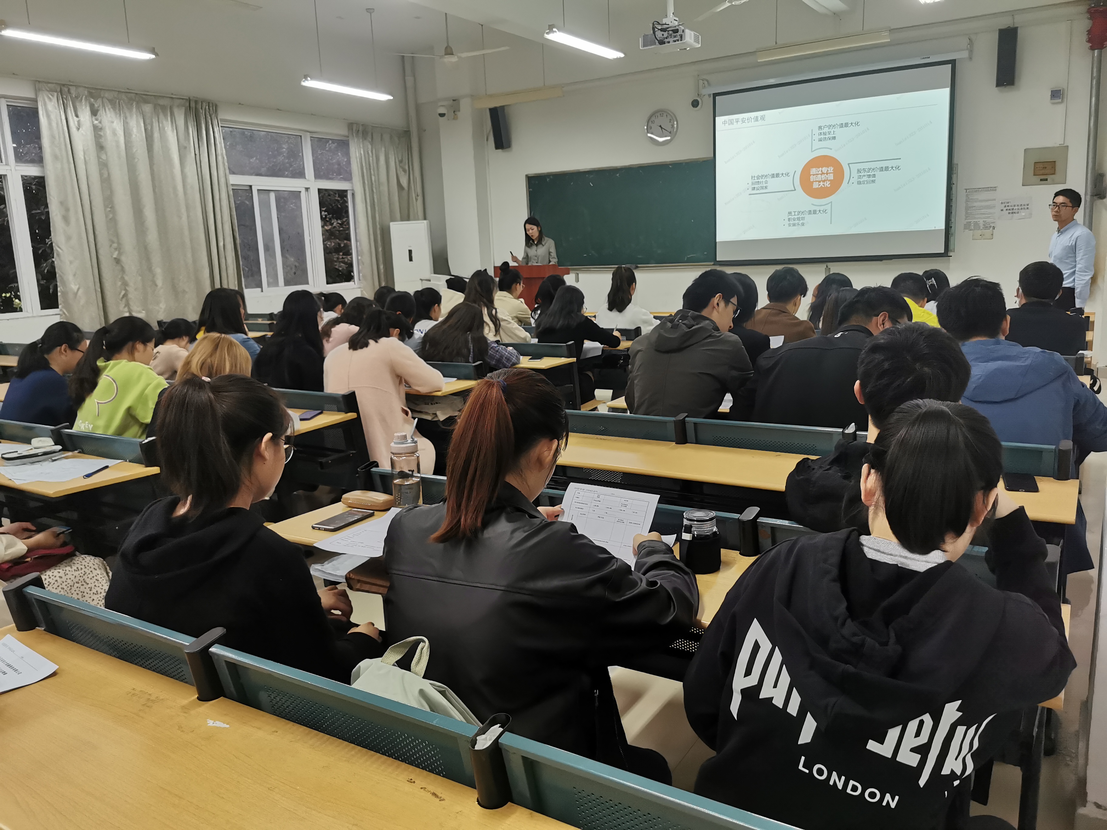 2020年10月15日,平安金服2020-2021年校園招聘會召開,平安金服合肥分公司高級講師方芳,平安財務(wù)共享中心區(qū)經(jīng)理韓磊主持本次招聘會,他們以平安集團(tuán)的架構(gòu)、企業(yè)文化、榮譽(yù)業(yè)績?yōu)橐^渡到平安金服歷史,組織架構(gòu),業(yè)務(wù)范圍以及行業(yè)榮譽(yù),讓同學(xué)從整體與細(xì)節(jié)兩方面了解平安金服。在最后的互動環(huán)節(jié),兩位主講人耐心回答著前來參加招聘會同學(xué)的問題。