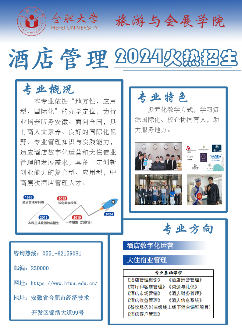 酒店管理(本科) 咨詢電話:0551-62159081 招生海報: