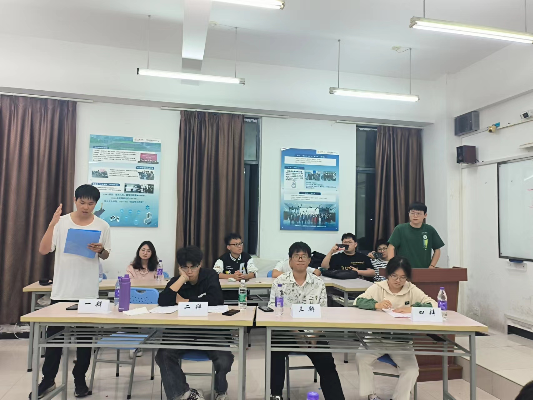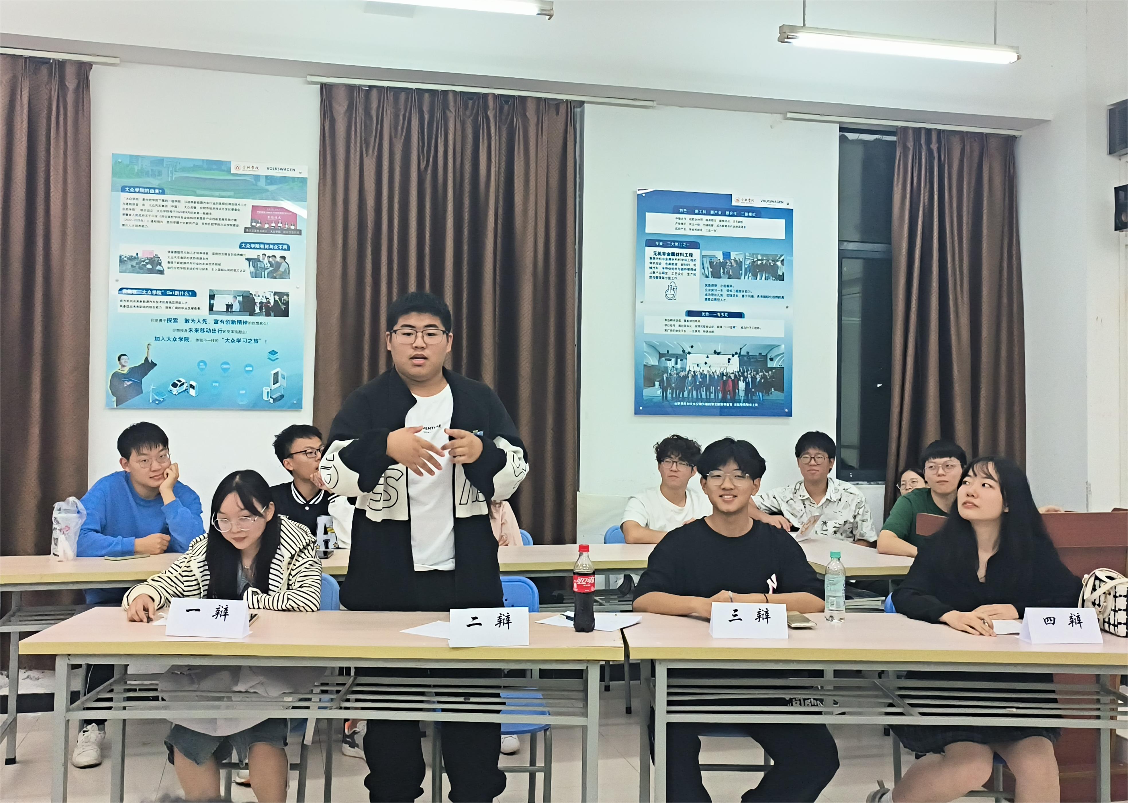 初賽由合肥大學(xué)校辯隊(duì)隊(duì)長(zhǎng)、經(jīng)濟(jì)與管理學(xué)院辯論隊(duì)隊(duì)長(zhǎng)桂欣蕾、經(jīng)濟(jì)與管理學(xué)院辯論隊(duì)副隊(duì)長(zhǎng)毛志煒和先進(jìn)制造與工程學(xué)院資深辯手李威擔(dān)任評(píng)委,蒞臨初賽的有大眾學(xué)院周冉老師。比賽共分為開(kāi)場(chǎng)陳詞、攻辯、攻辯小結(jié)、自由辯論、評(píng)委提問(wèn)、總結(jié)陳詞六個(gè)環(huán)節(jié)。