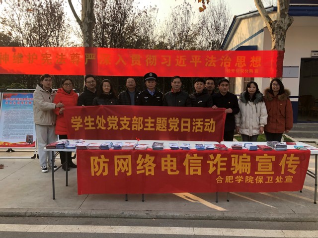 12月4日是我國第六個“憲法宣傳日”,當天下午,學生處黨支部聯合合肥市公安局經開分局在學校二期小北門校警務站門前開展了防網絡詐騙、防邪教為主題的普法宣傳主題黨日活動。學生處黨支部成員、校黨委副書記劉建中,校黨委委員、黨委學生工作部部長、學生處處長朱濤及全體學生處領導老師和學校保衛處領導老師及合肥市公安局經開分局領導等共同參加了這次普法活動。